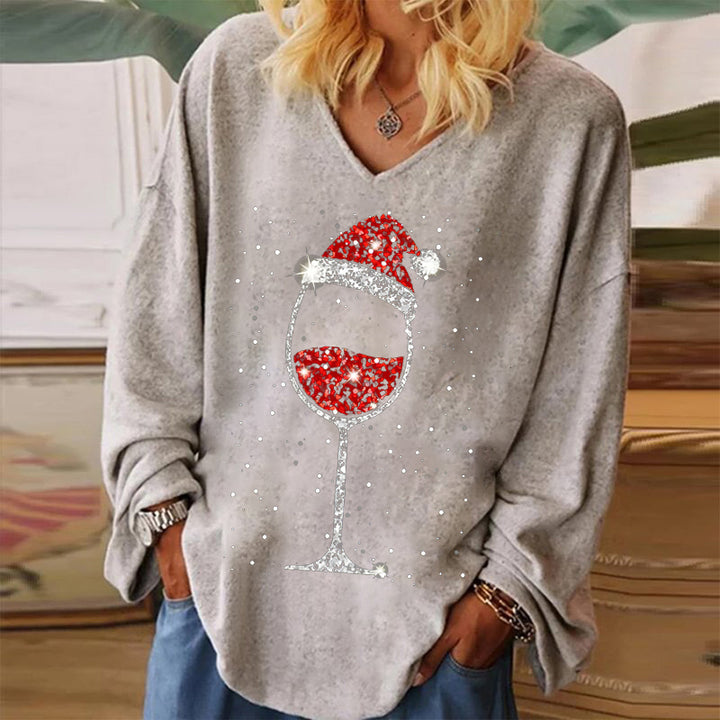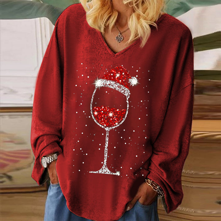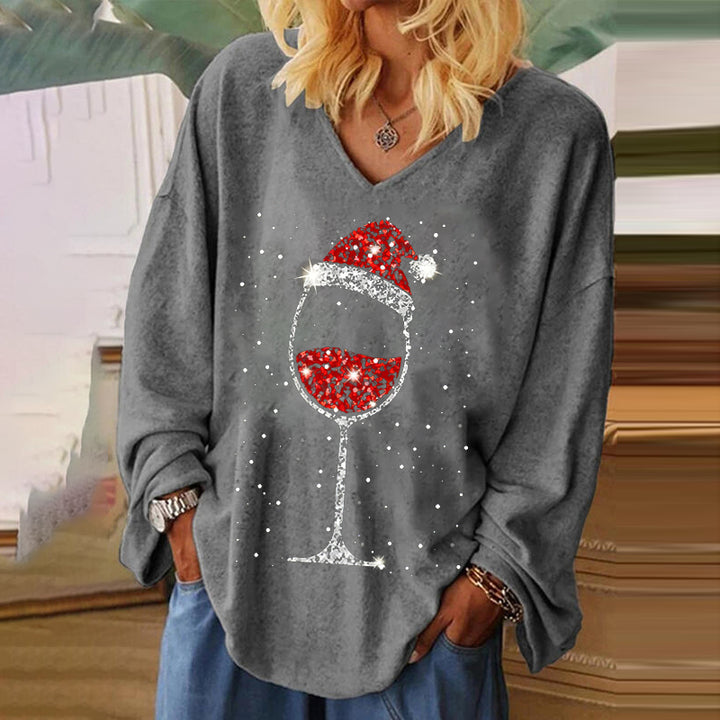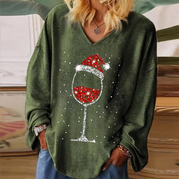 Christmas Hat Wine Glass Printed V-neck Women's T-shirt