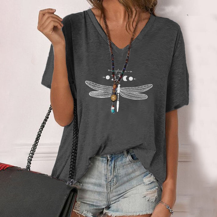 Product Name  Dragonfly Moon Print Casual V-neck T-shirt
