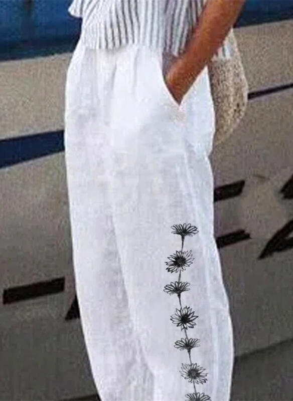 Mid Waist Floral Print Pocket Linen Straight Leg Lounge Pants
