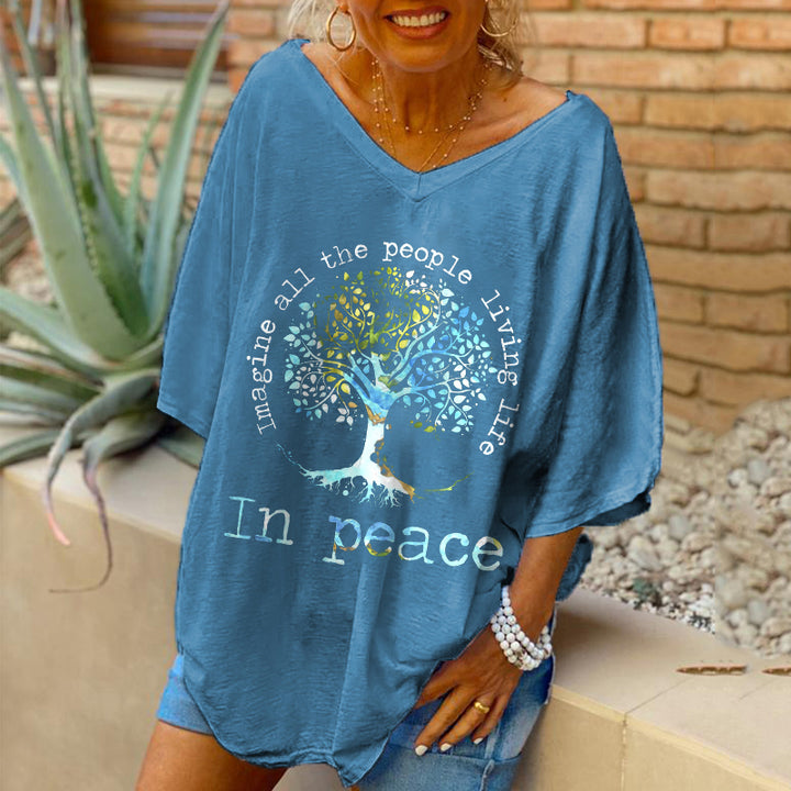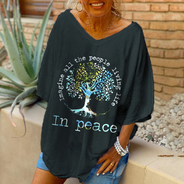 Oversized Imagine All The People Living Life In Peace Tree Printed Women Hippie T-shirt