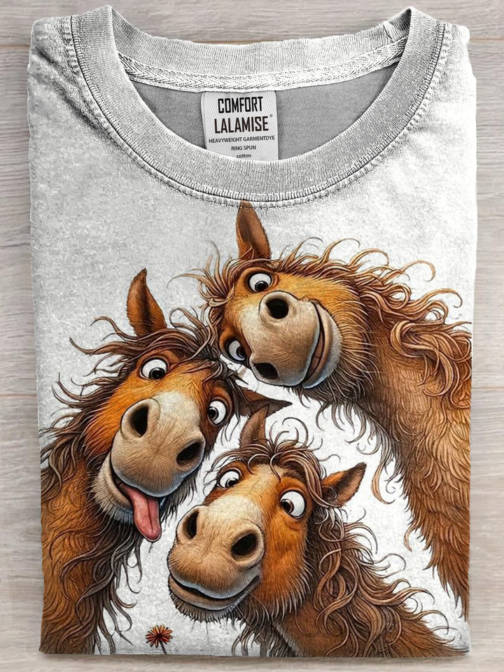 Retro Funny Horses Art Print Casual Short Sleeve T-shirt